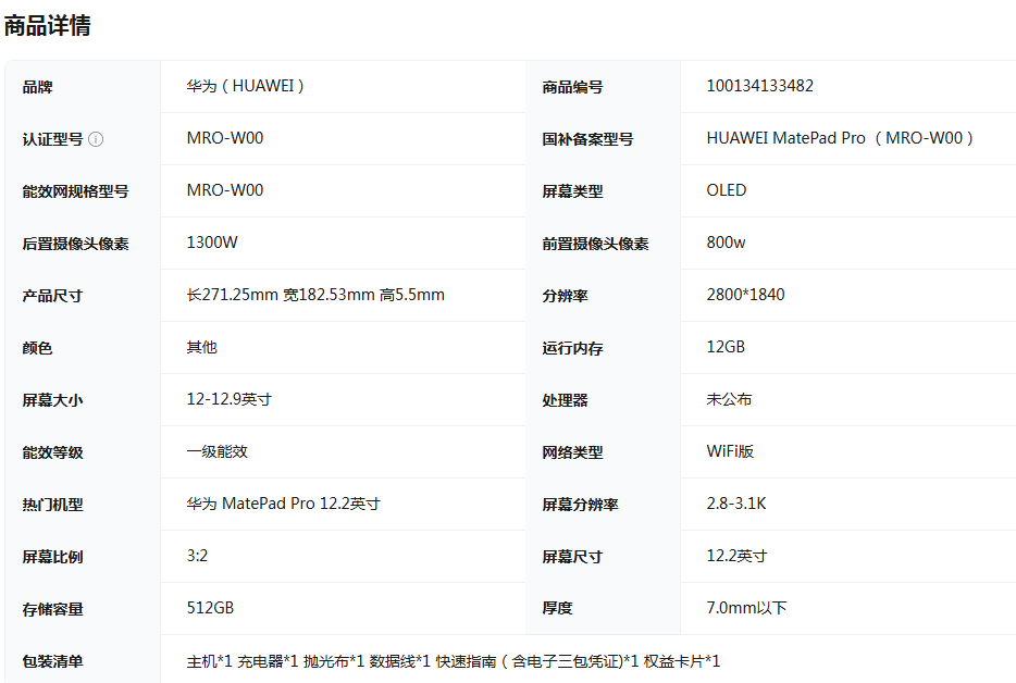 华为/Huawei 平板式微型计算机 MatePad Pro 12.2英寸柔光版华为平板电脑双层OLED柔光屏12+512GB WIFI砚黑(含皮套)
