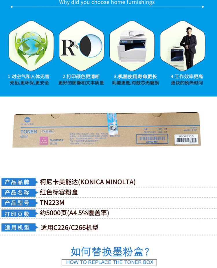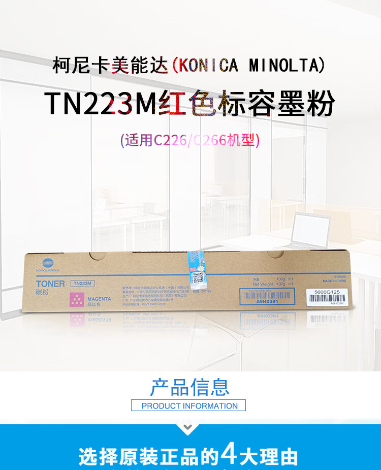 柯尼卡美能达/KONICAMINOLTA 粉盒 TN223M 柯美碳粉盒红色标容墨粉1支 (适用C226/C266) 印量5000页