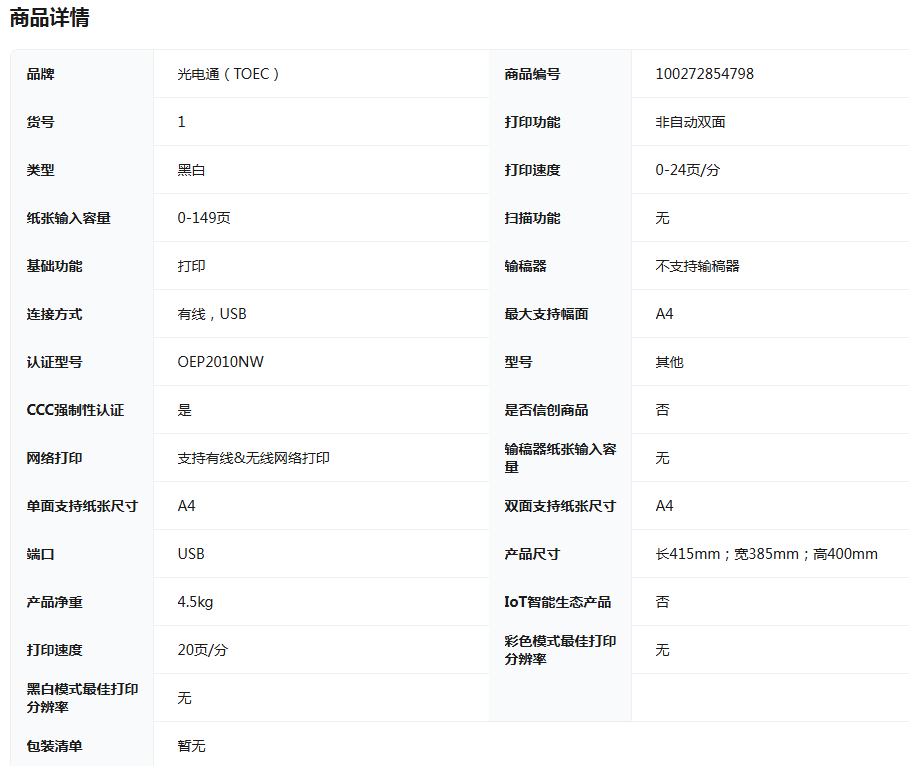光电通/TOEC A4 黑白打印机 OEP2010NW 黑白激光打印机 支持有线网络/无线打印 高效打印不卡纸