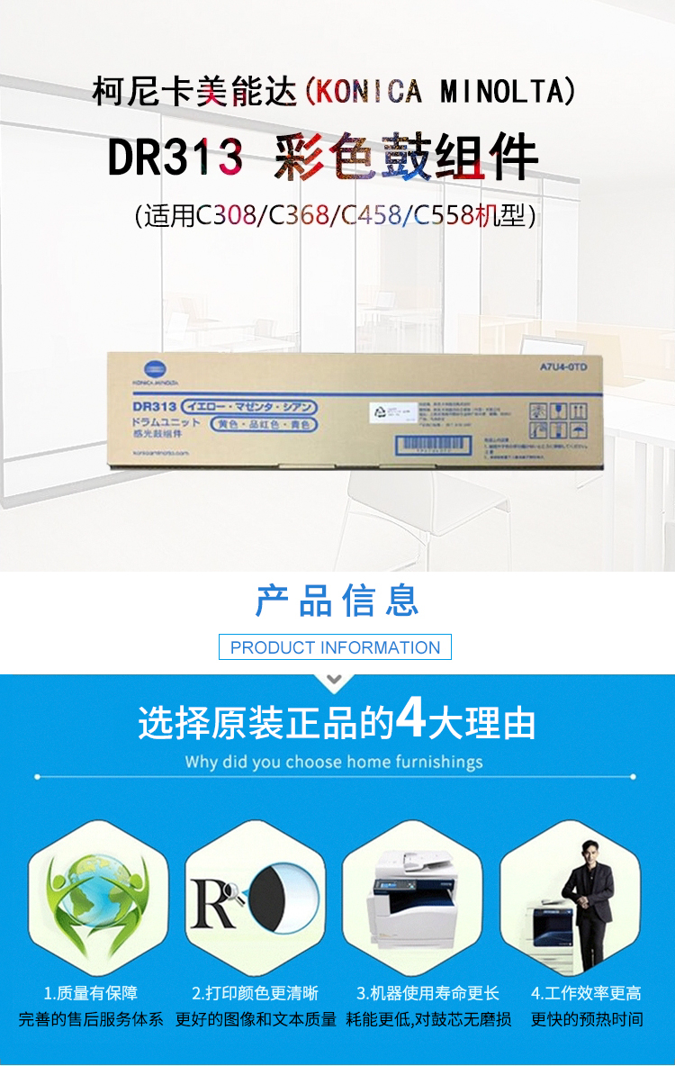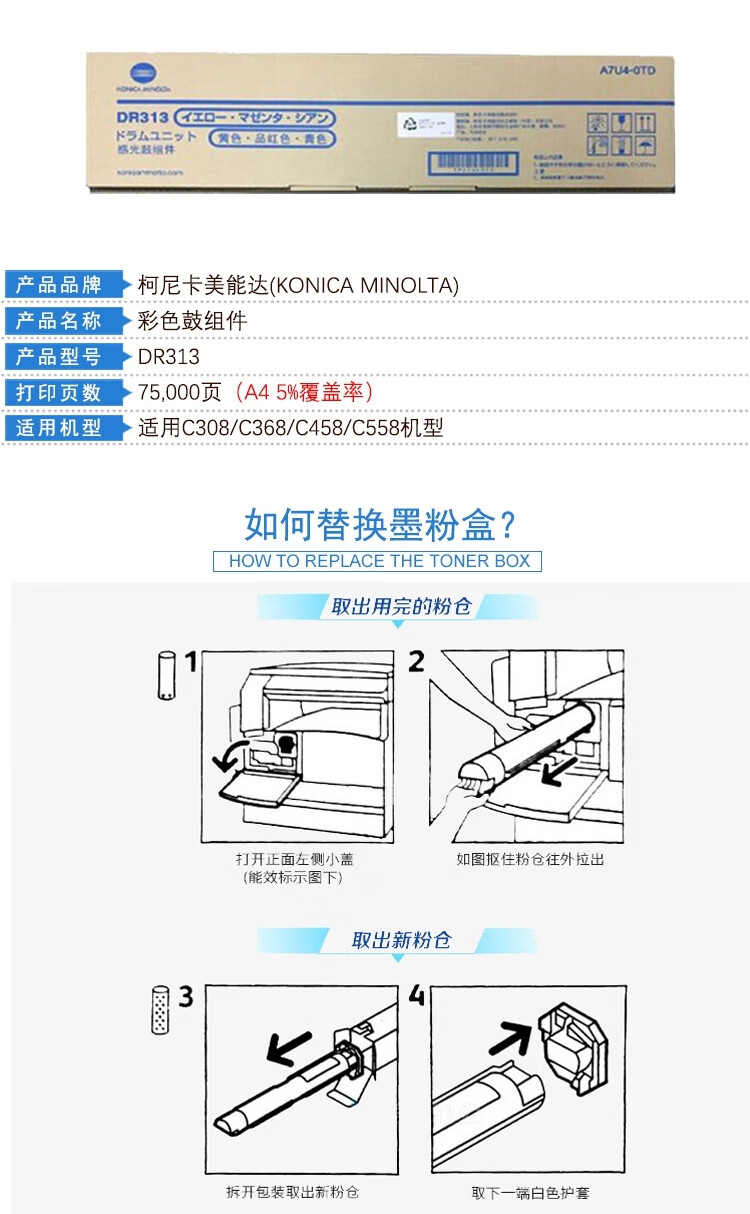 柯尼卡美能达/KONICAMINOLTA 硒鼓 DR313 打印量75000页/支 适用C308/C368/C458/C558机型 鼓组件 彩色(计价单位:支)