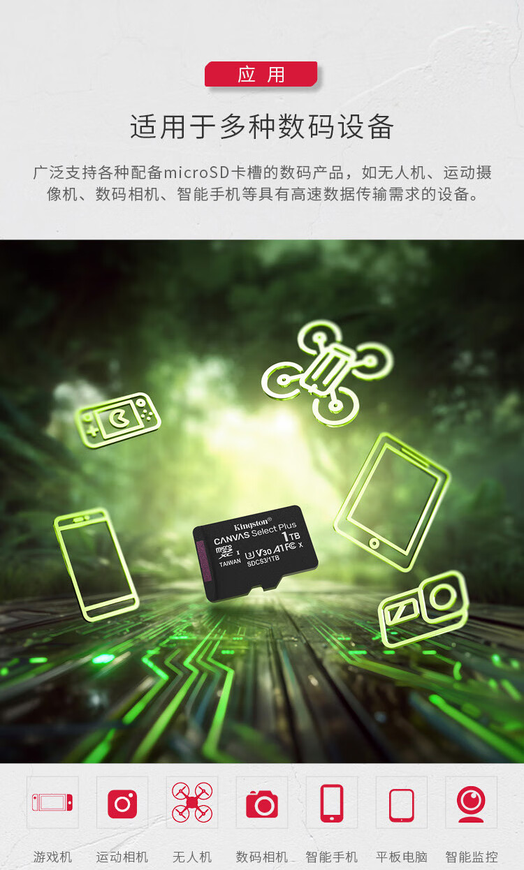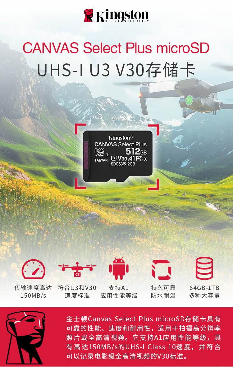 金士顿/Kingston U盘/存储卡 512GB TF(MicroSD) 存储卡 U3 A1 V30 内存卡 读速150MB/s 适配无人机/运动相机/switch/监控